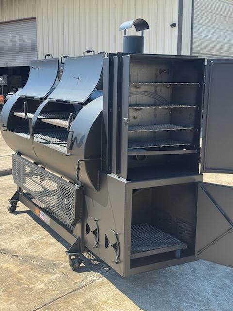 Competitive Smoker Cooker on Swivel Wagon Wheel Cart Frame. Our largest series, excellent for onsite or on location catering and commercial use.